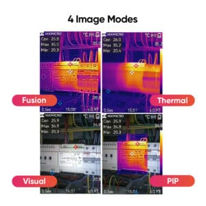 Met de ingebouwde IR-camera en visuele camera kun je schakelen tussen 4 beeldmodi: Thermisch, Visueel, PIP en Fusion. ‘Thermisch’ is het warmtebeeld en ‘Visueel’ wat je ook met het blote oog ziet. “Fusion” combineert belangrijke details van de visuele camera met het warmtebeeld van de IR-camera. Dit zorgt voor extra details en helderheid. “PIP” legt een vast gedeelte van een warmtebeeld over een digitale foto om de locaties van afwijkingen te verduidelijken.