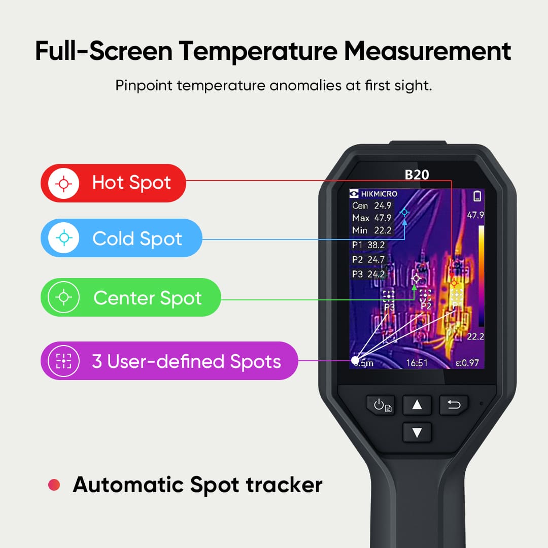 Meet nauwkeurig temperaturen van -20°C tot 550°C met een temperatuurnauwkeurigheid tot +/-2°C of +/-2%. Doordat hij automatisch de ‘hot spot’, ‘cold spot’ en ‘center spot’ vindt, zie je in één oogopslag waar er temperatuurafwijkingen zijn. Zijn er hoge temperaturen? Dan geven de ingebouwde luidspreker en flitslamp een audio- en visueel alarm, om gevaarlijke situaties en verwondingen te voorkomen.