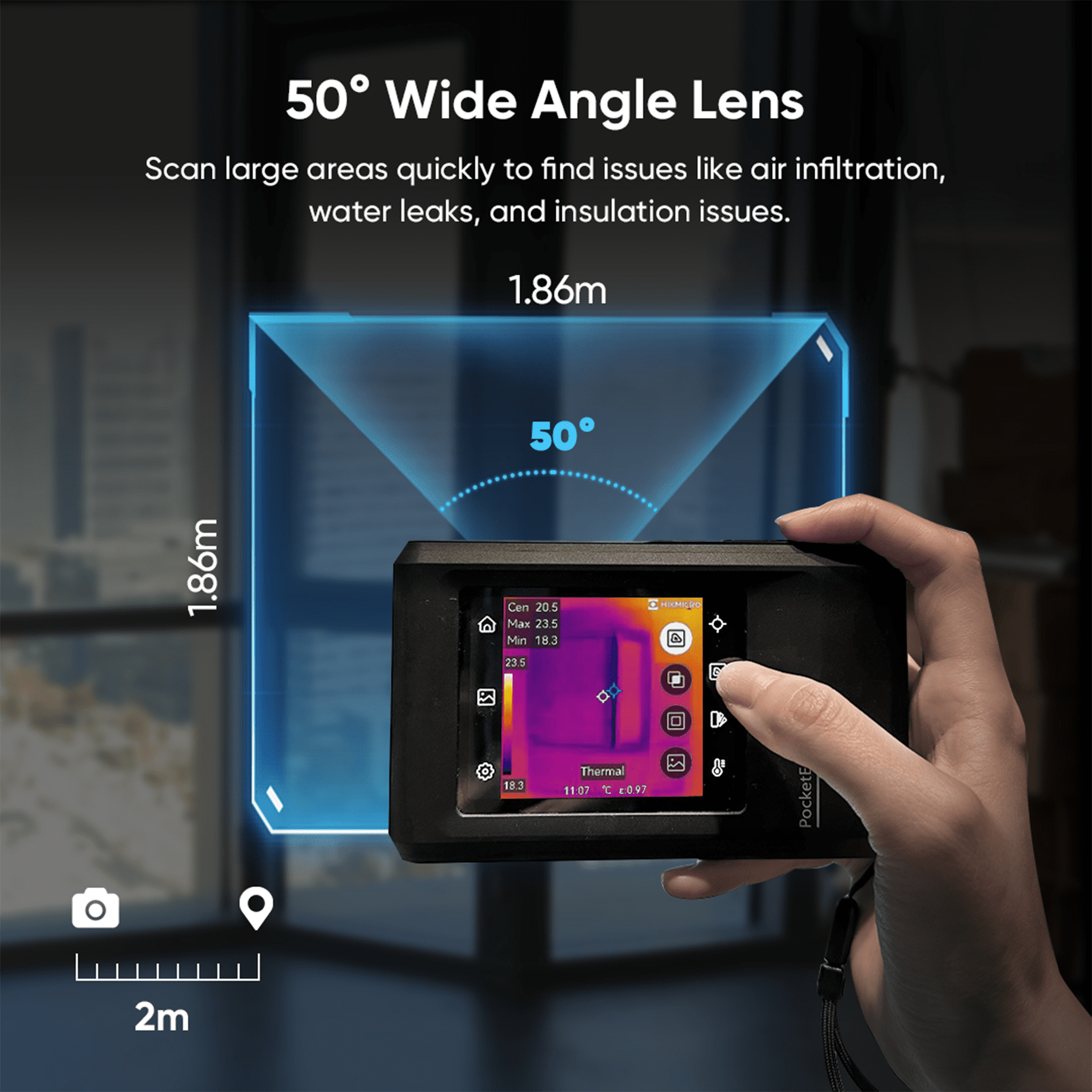 Met de 50º groothoeklens scan je snel grote oppervlakken zodat je problemen als waterlekken, isolatieproblemen of luchtinfiltratie makkelijk opspoort. Wil je een gebied beter bekijken? Tik op dit gebied op het scherm en het verhoogt direct het beeldcontrast en markeert mogelijke problemen.
